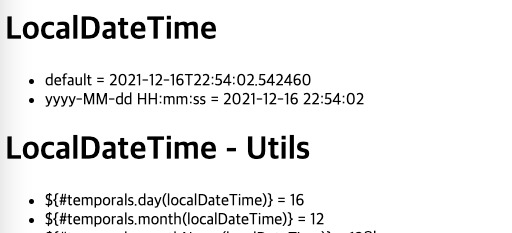 <li>default = <span th:text="${localDateTime}"></span></li> <!-- LocalDateTime 변수 보여준다.-->