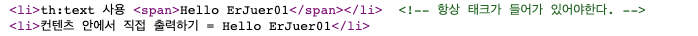 <li>th:text 사용 <span th:text="${data}"></span></li> <!-- 항상 태크가 들어가 있어야한다. -->