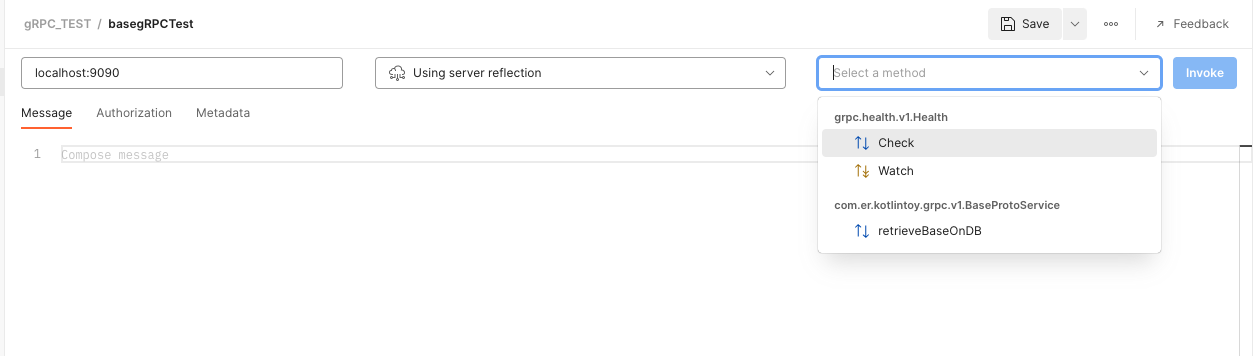 - gRPC 서버와 Port 입력 (localhost:9090)