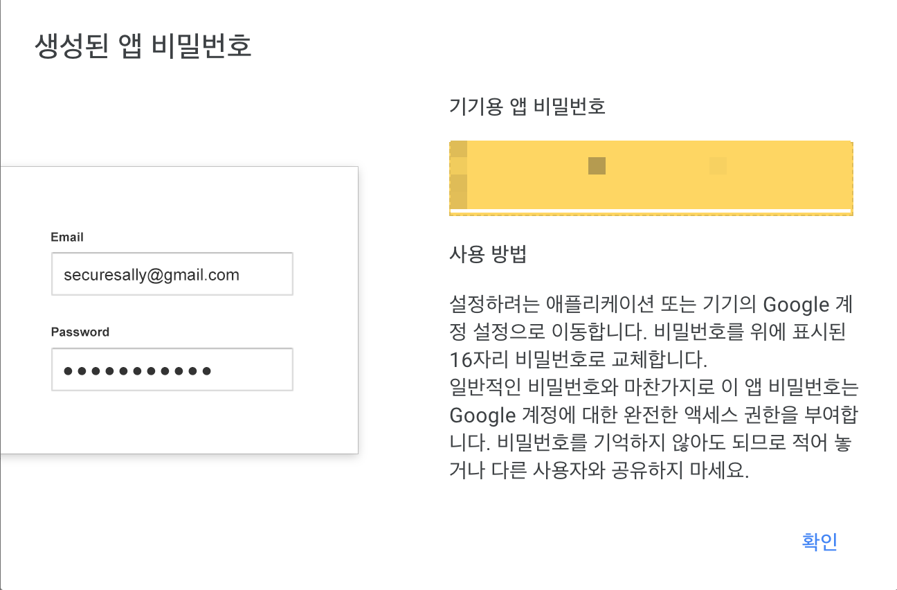 다음과 같이 앱 비밀번호가 자동으로 생성된 후 해당 비밀번호를 활용하여 진행하면 된다.