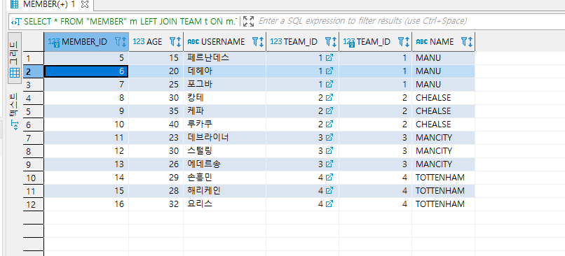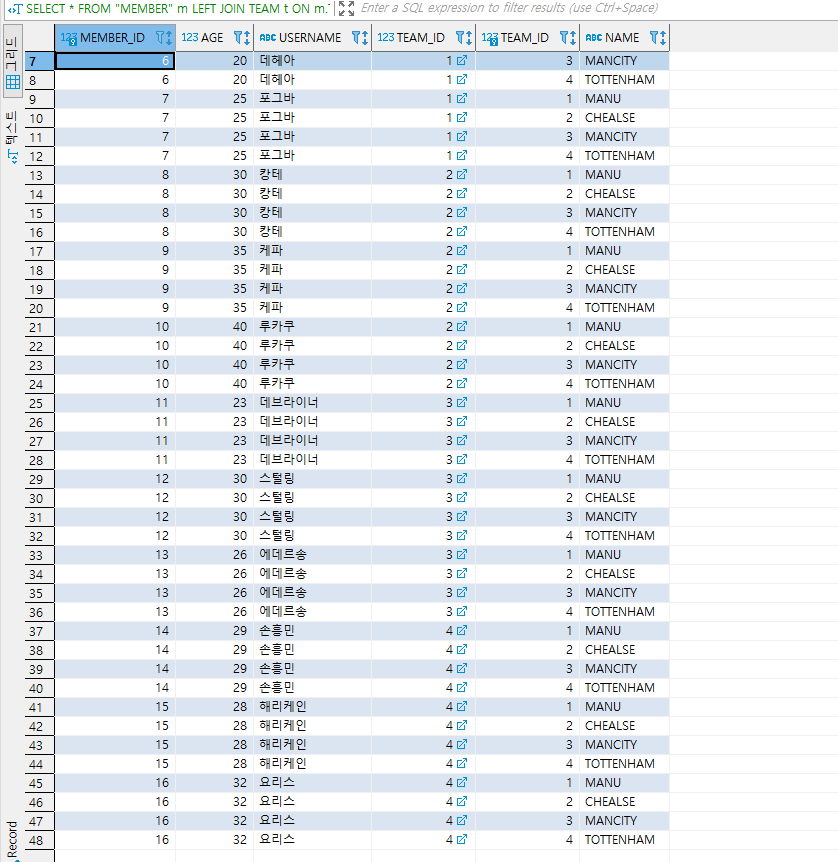 3) Member의 Team Id와 Team의 Team Id값을 1차적으로 붙인 다음 Team의 이름이 'MANCITY' 인 것을 필터링 하는 것이다.